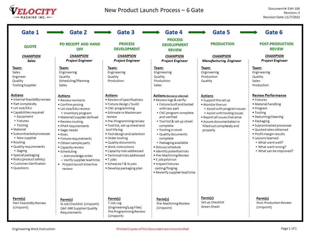 Velocity Machine becomes infused into every aspect of a project to ensure we meet specific production and service requirements to our OEM partners worldwide. As a Tier 1 solutions provider, we lean on our Six-Gate Launch Process and focused expertise of our subcontractor services to ensure success and an on-time delivery of the finished project.