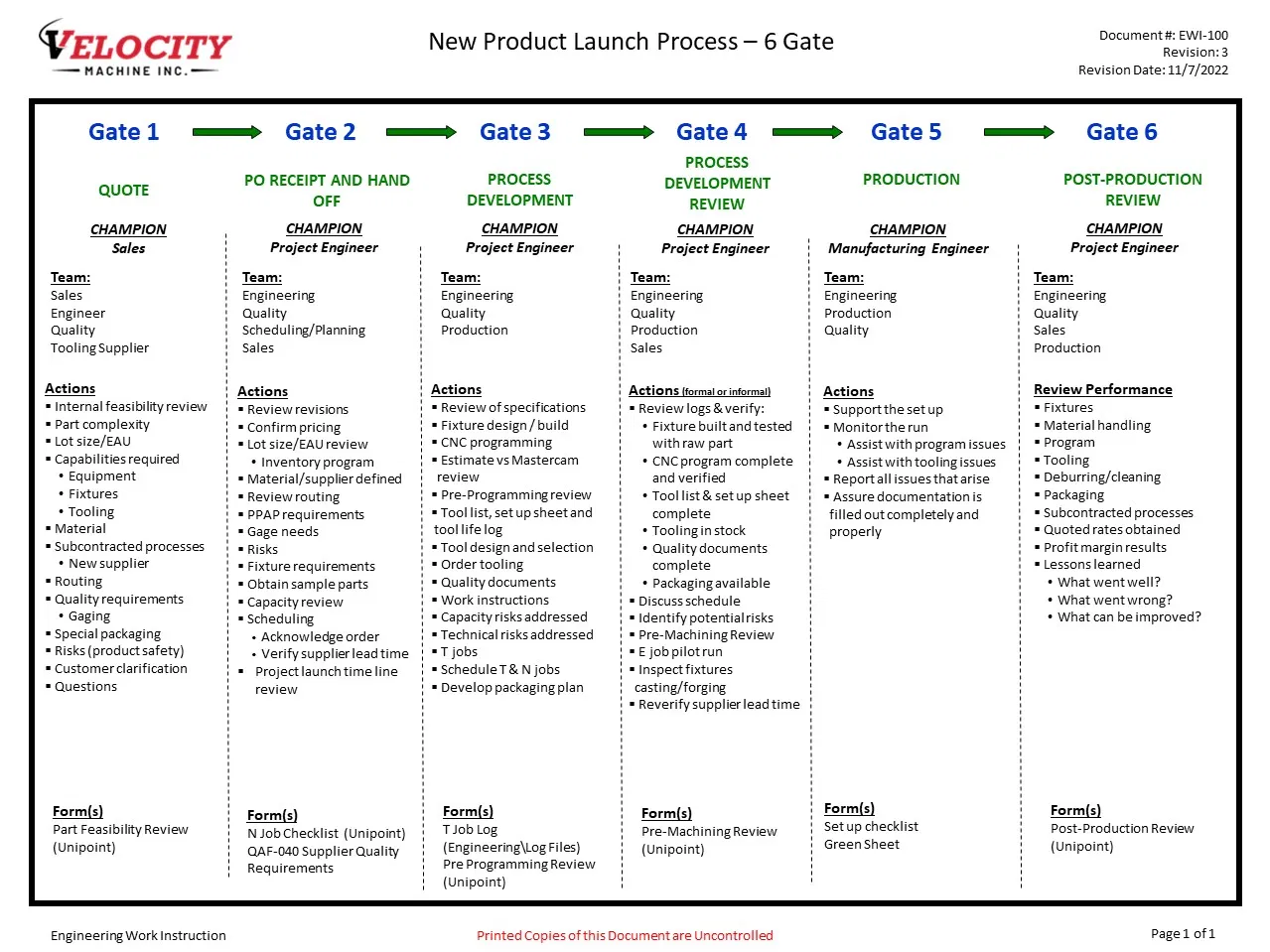 Velocity Machine becomes infused into every aspect of a project to ensure we meet specific production and service requirements to our OEM partners worldwide. As a Tier 1 solutions provider, we lean on our Six-Gate Launch Process and focused expertise of our subcontractor services to ensure success and an on-time delivery of the finished project.